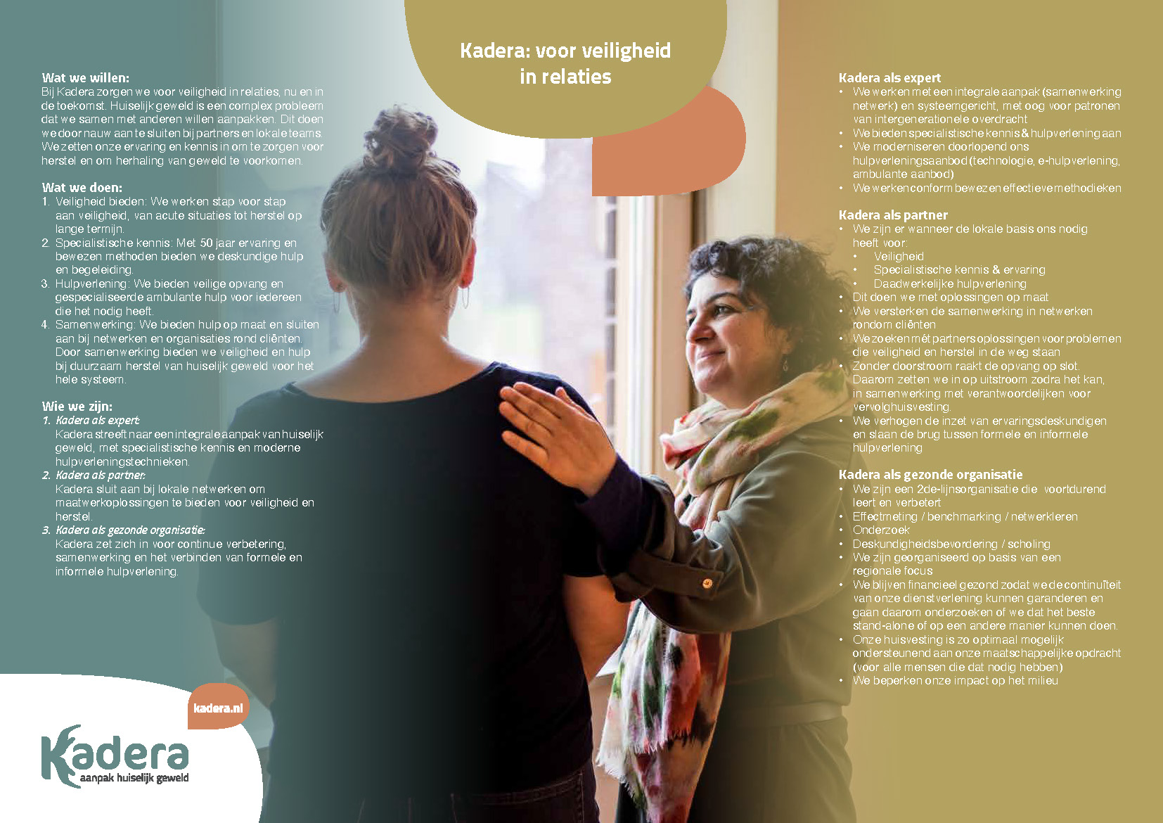 Bij Kadera zorgen we voor veiligheid in relaties, nu en later. Huiselijk geweld is een complex probleem dat we samen met anderen willen aanpakken. Dit doen we door nauw aan te sluiten bij partners en lokale teams. We zetten onze ervaring en kennis in om te zorgen voor herstel en om herhaling van geweld te voorkomen.